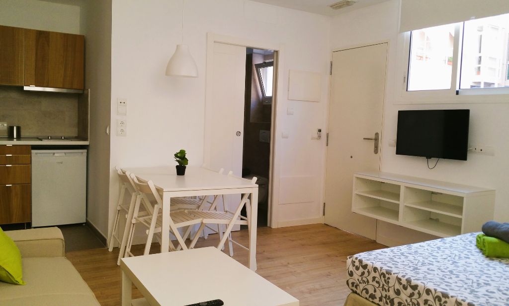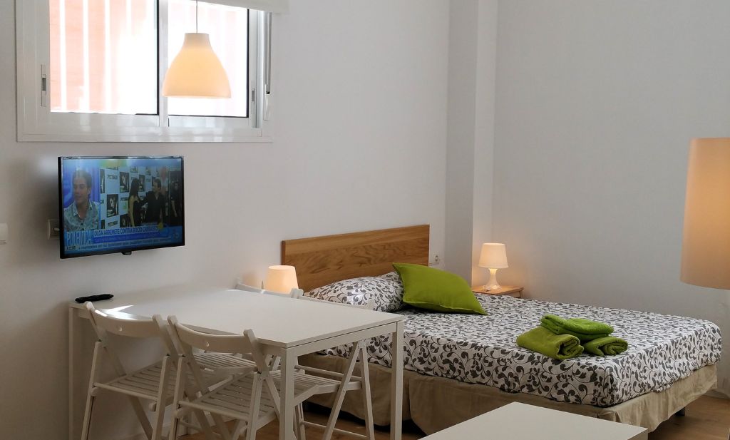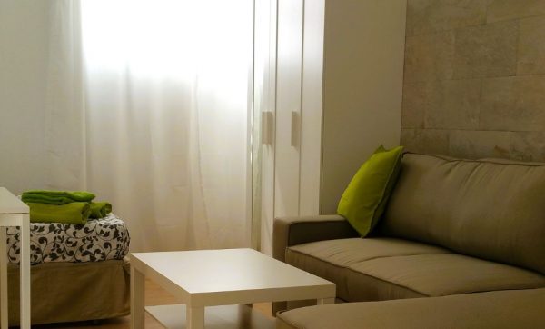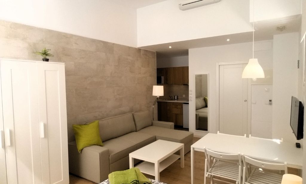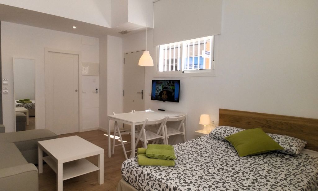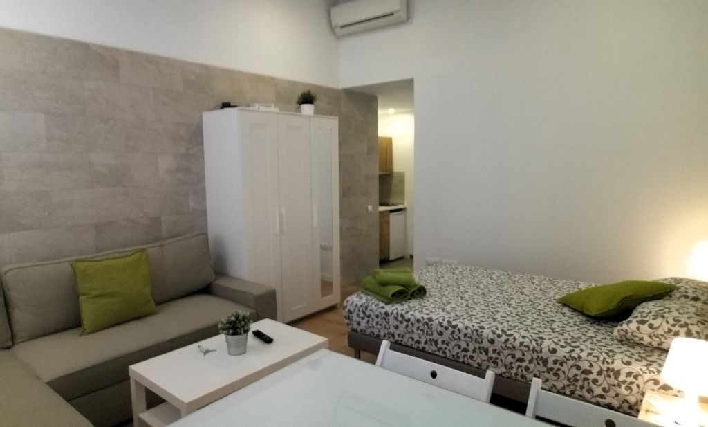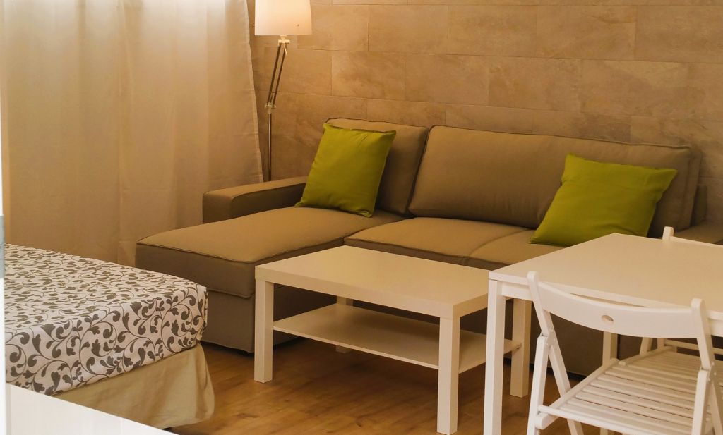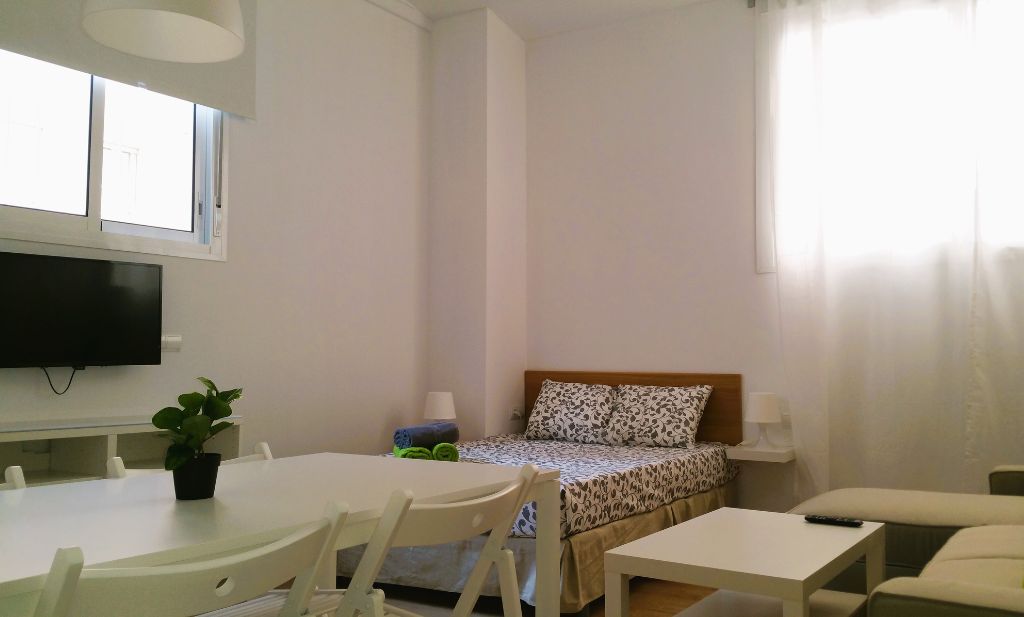 Dirección: Pasaje La Trini, 7. Estudio luminoso con entrada privada, sofá, zona de cocina, utensilios de cocina y aire acondicionado. El sofá cama opcional es para 2 personas.