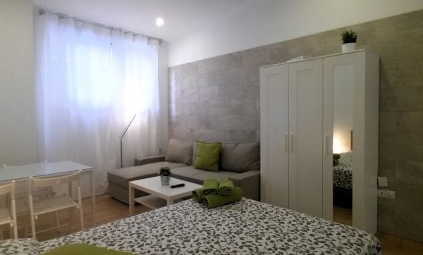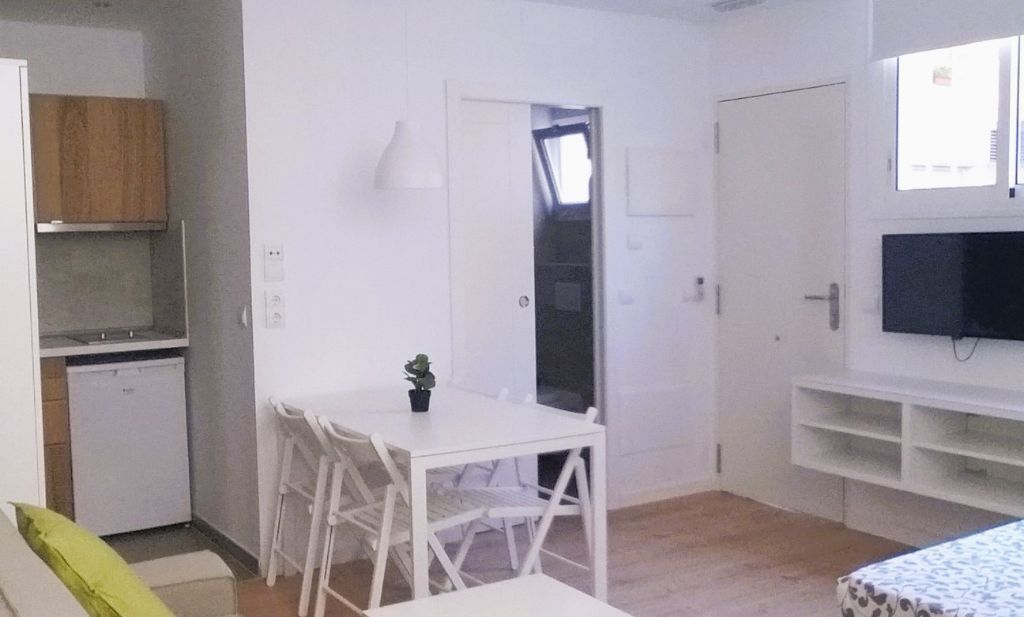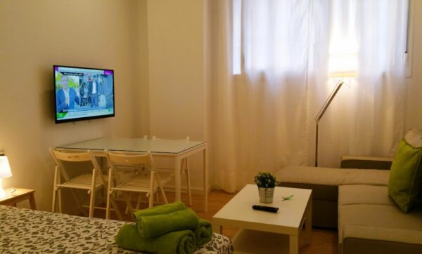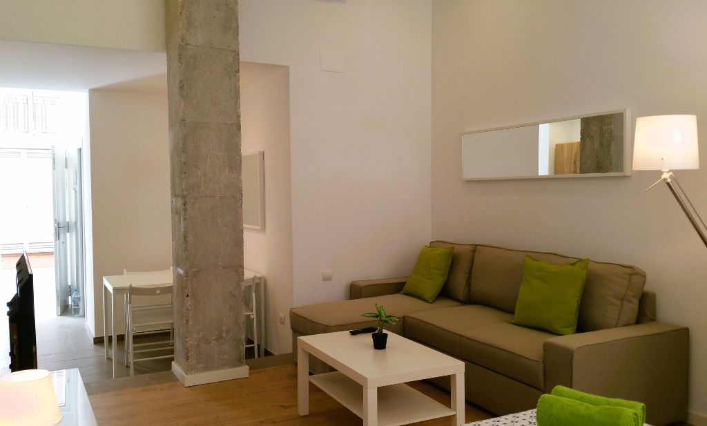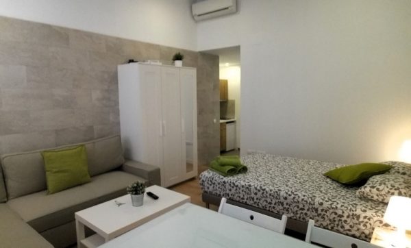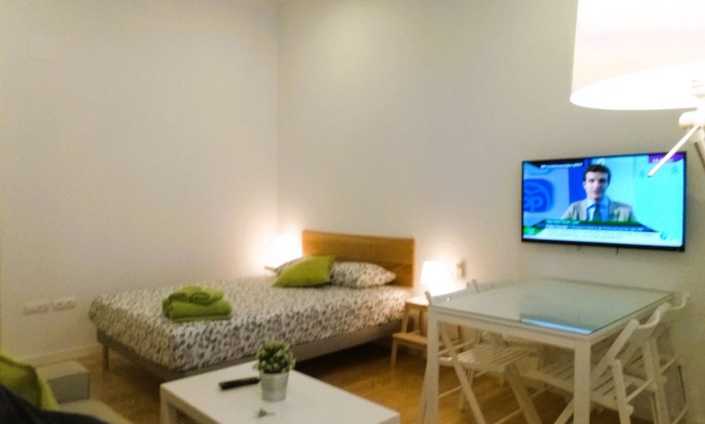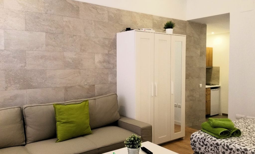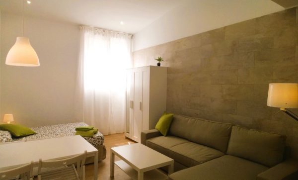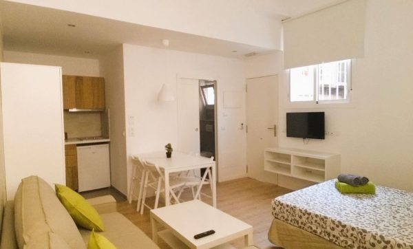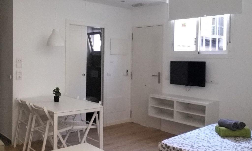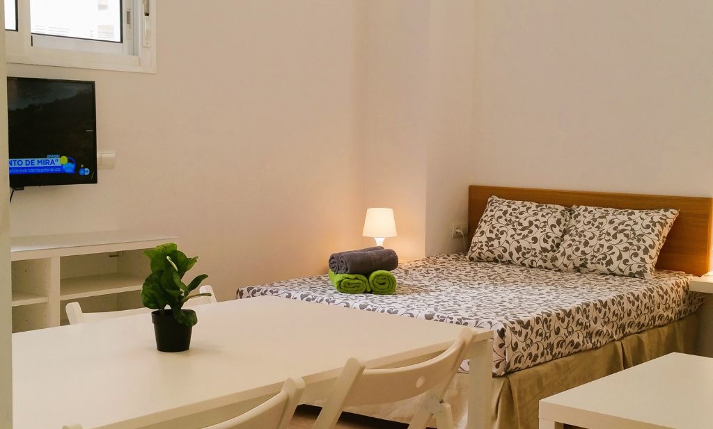 Dirección: Pasaje La Trini, 7. Estudio luminoso con entrada privada, sofá, zona de cocina, utensilios de cocina y aire acondicionado. El sofá cama opcional es para 2 personas.