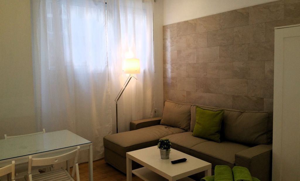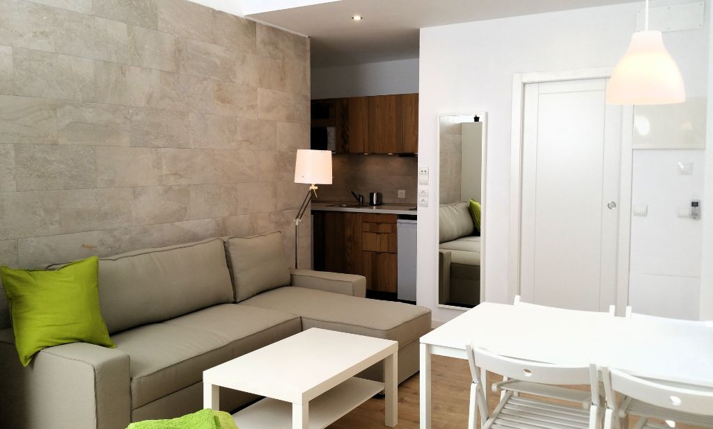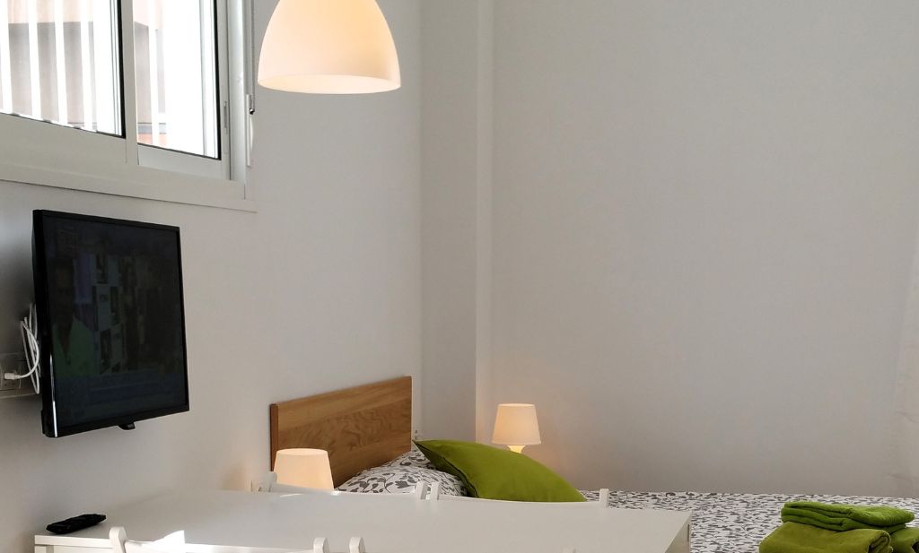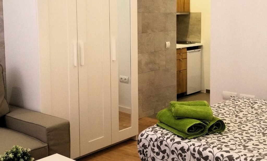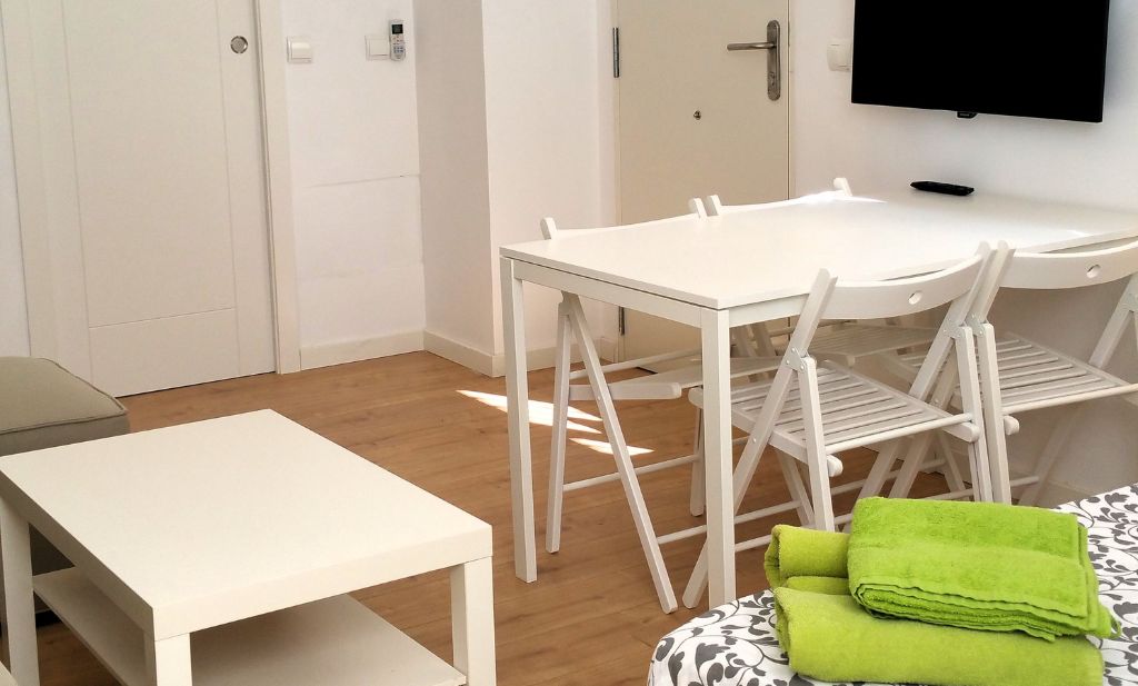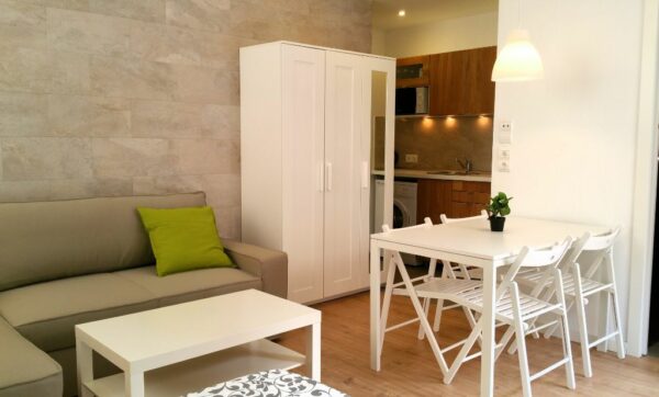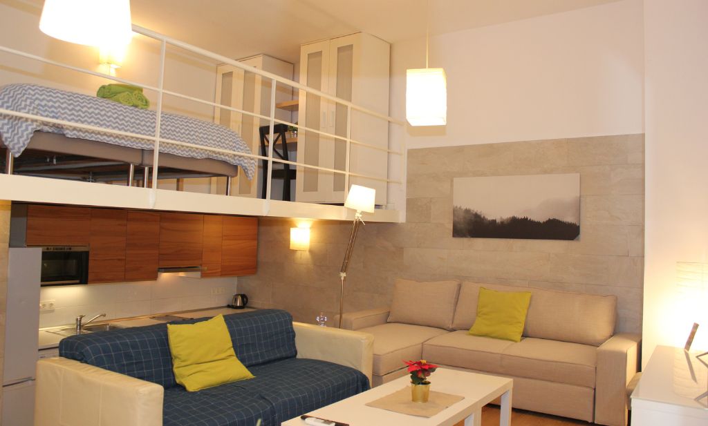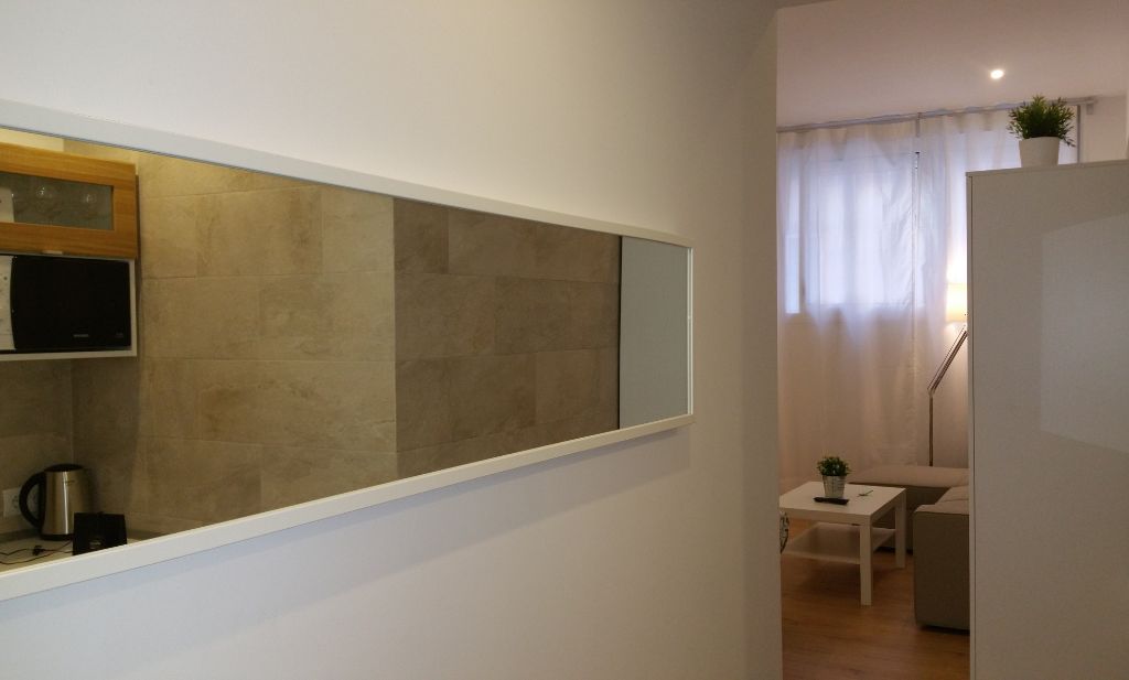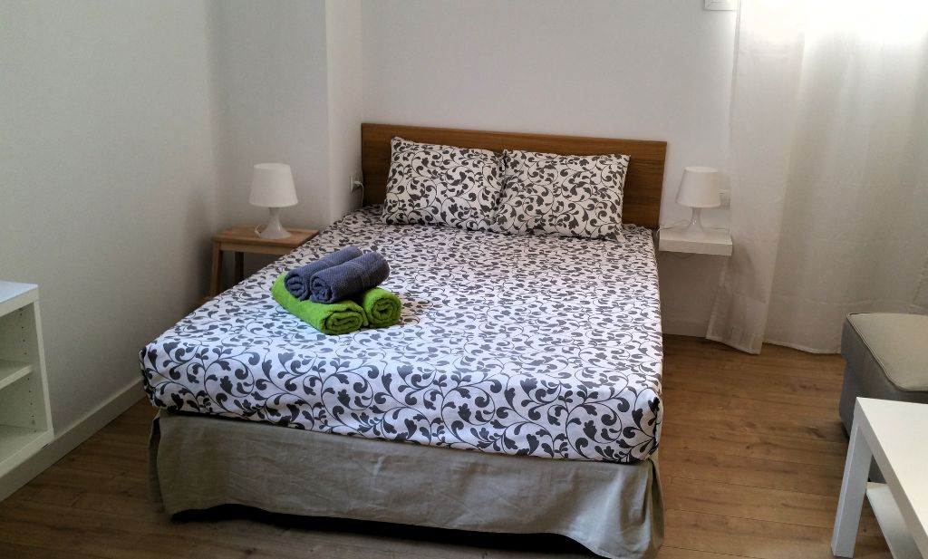 Dirección: Pasaje La Trini, 7. Estudio luminoso con entrada privada, sofá, zona de cocina, utensilios de cocina y aire acondicionado. El sofá cama opcional es para 2 personas.