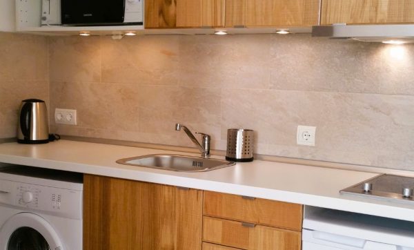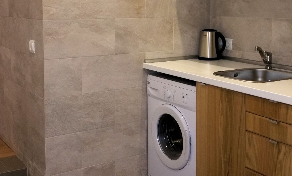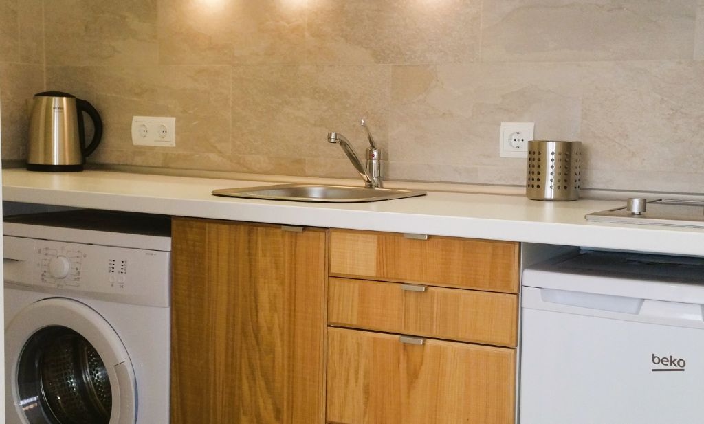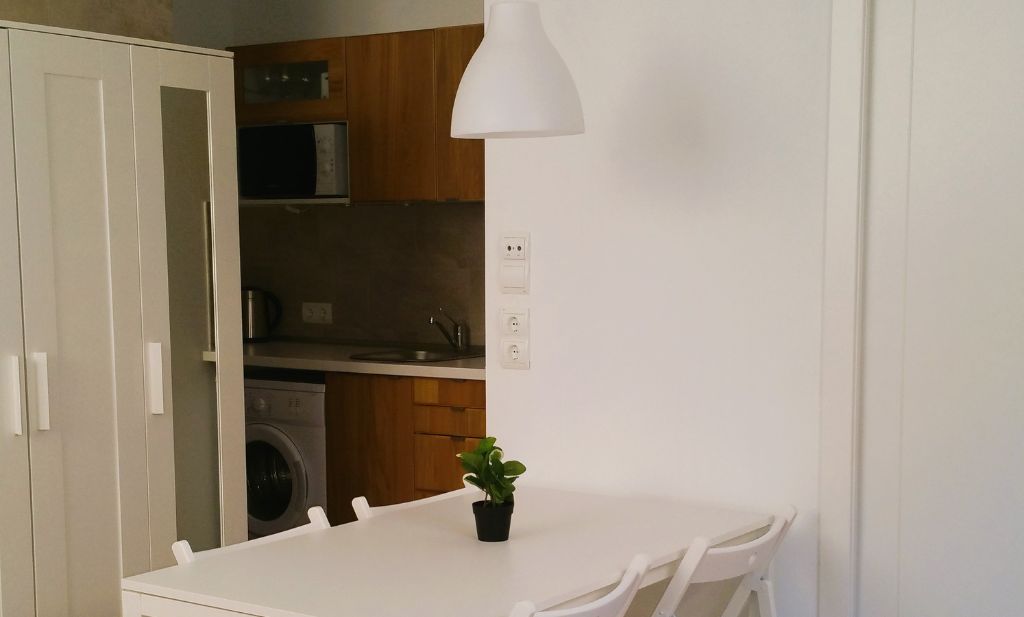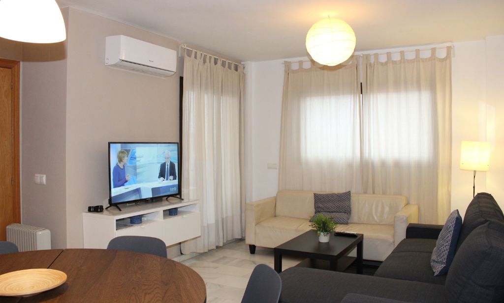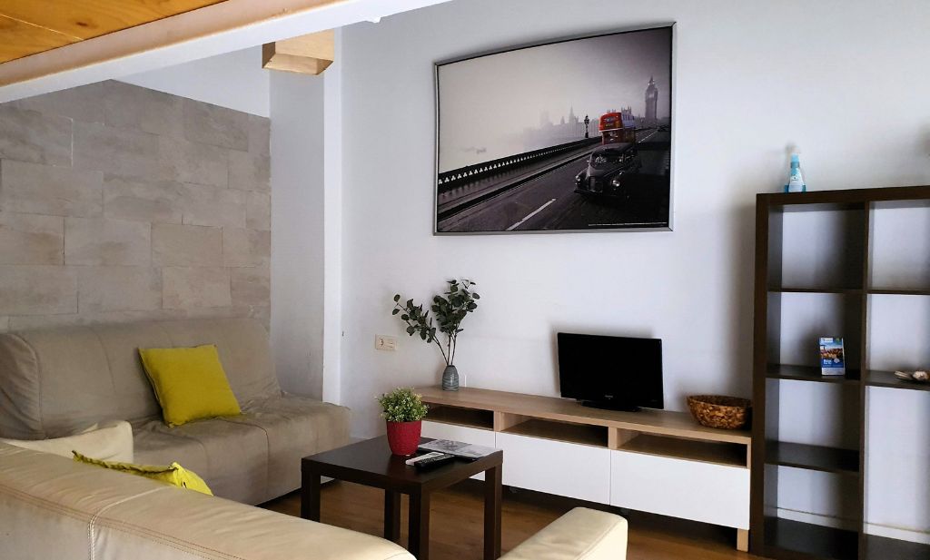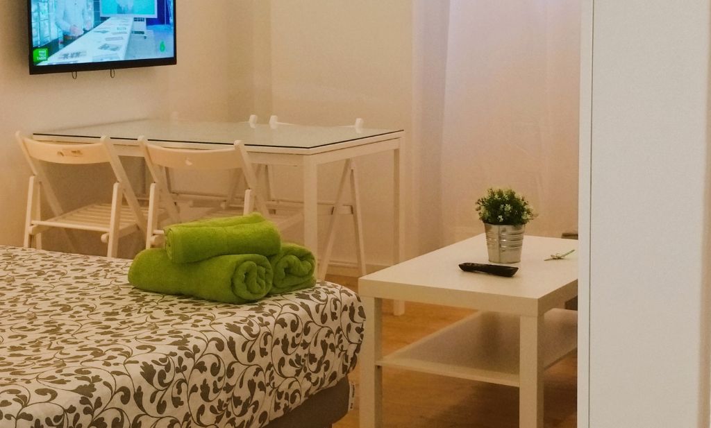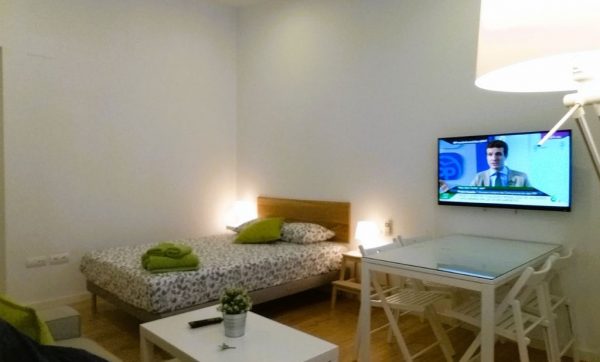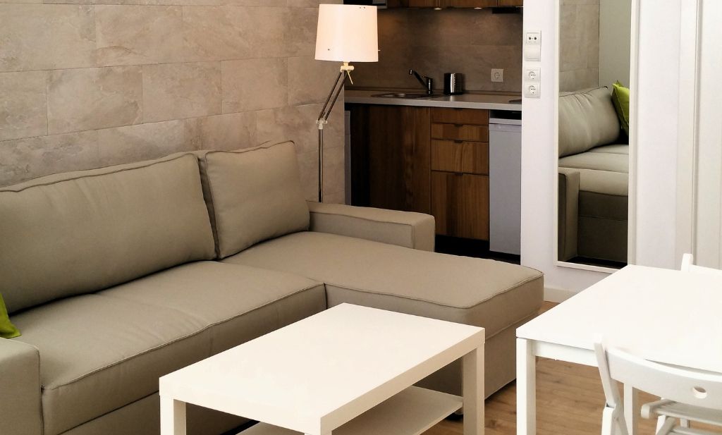Dirección: Pasaje La Trini, 7. Estudio luminoso con entrada privada, sofá, zona de cocina, utensilios de cocina y aire acondicionado. El sofá cama opcional es para 2 personas.